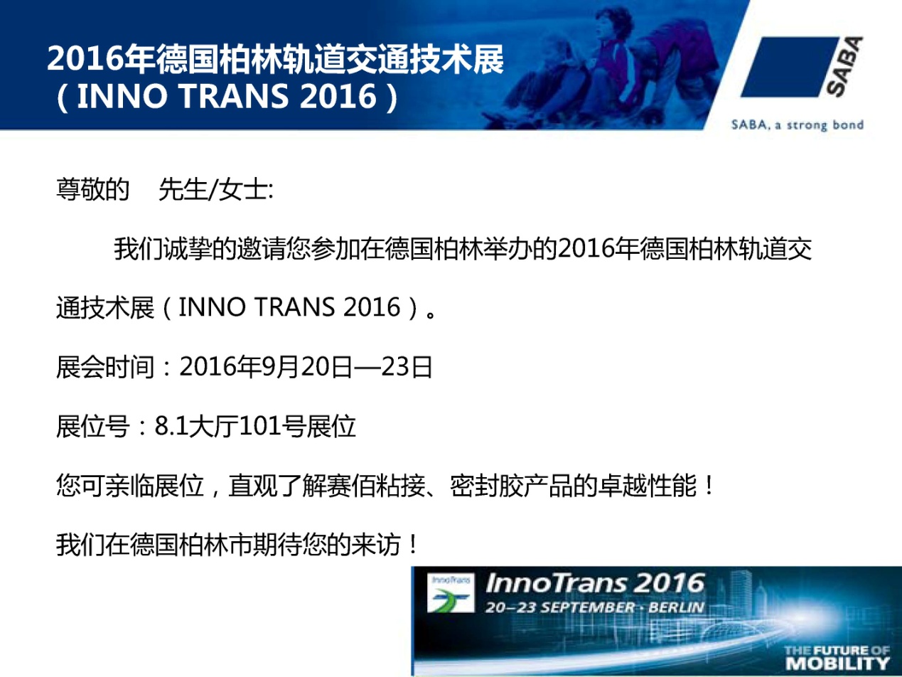 荷蘭SABA賽佰有幸受邀將于2016年9月20日—23日參加在德國柏林市舉辦的2016年德國柏林軌道交通技術展(INNO TRANS 2016).