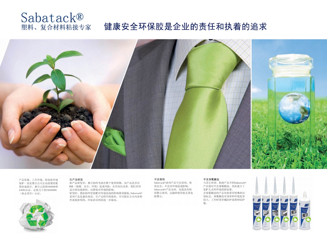 荷蘭SABA將“致力于更環保、更強力的膠粘技術”視為企業理念,在產品研發的過程中,始終考慮產品在整個使用周期是否會對HSE(健康、安全、環境)造成風險,從而加以改善。改性硅烷膠Sabatack@系列產品便是環保膠的最佳典范,與其它密封、粘接產品不同,荷蘭SABA改性硅烷膠Sabatack@系列產品不含異氰酸酯(異氰酸酯是引起職業性哮喘最常見的原因,且誘發的哮喘經常發展為重癥哮喘,對人體健康有極其嚴重的危害)和溶劑,且產品無毒無味,經國內權威檢測機構PONY譜尼測試集團的專業檢測,荷蘭SABA環保膠中的苯、甲苯等VOC排放極低,且該系列產品取得了第三方檢測機構譜尼氣味認證,證明賽佰環保膠使用安全,不會對環境造成影響。