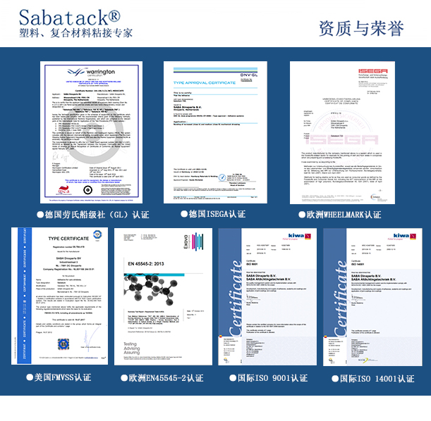 產(chǎn)品認(rèn)證除了注重公司的質(zhì)量和安全外,SABA產(chǎn)品的質(zhì)量和安全更是重中之重。SABA的所有產(chǎn)品均執(zhí)行相關(guān)標(biāo)準(zhǔn)和法規(guī)要求,使用安全,產(chǎn)品用途與研發(fā)理念相符。SABA的粘接膠系統(tǒng)可調(diào)整至客戶要求的特定標(biāo)準(zhǔn)。在產(chǎn)品研發(fā)方面,SABA研發(fā)部門遵照相關(guān)國際標(biāo)準(zhǔn),如DIN,EN,ISO,ASTM。SABA產(chǎn)品已獲得如下認(rèn)證,KIWA, TNO, TüV and LGA